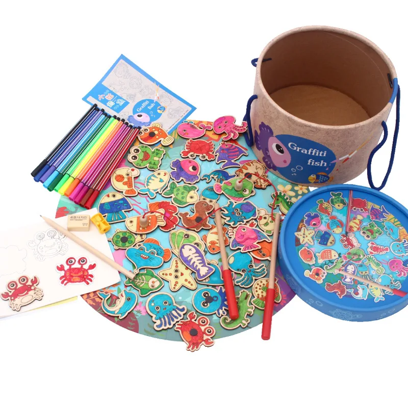 HOT Sale Kids Magnetic Fishing Puzzle DIY Graffiti Montessori Educational Wooden Toys For Children Learning